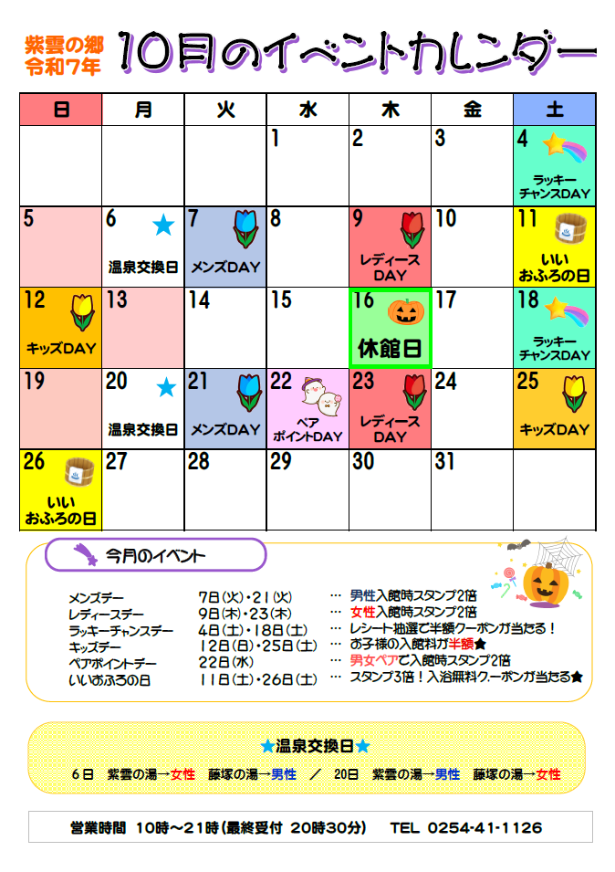 - 10/6(日) 紫雲の湯 → 女性、藤塚の湯 → 男性