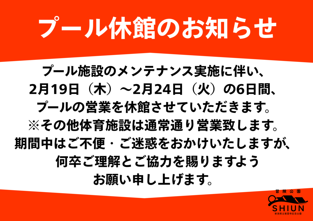 【お知らせ】紫雲の郷 プール施設 メンテナンス休館のお知らせ【プール施設】