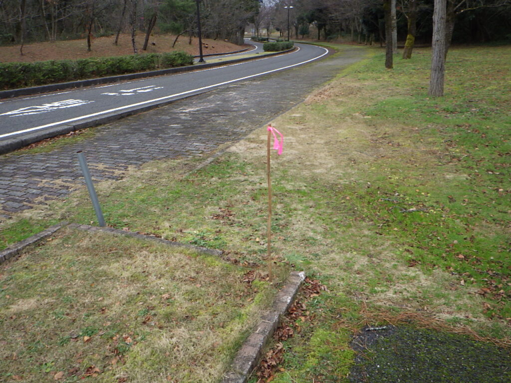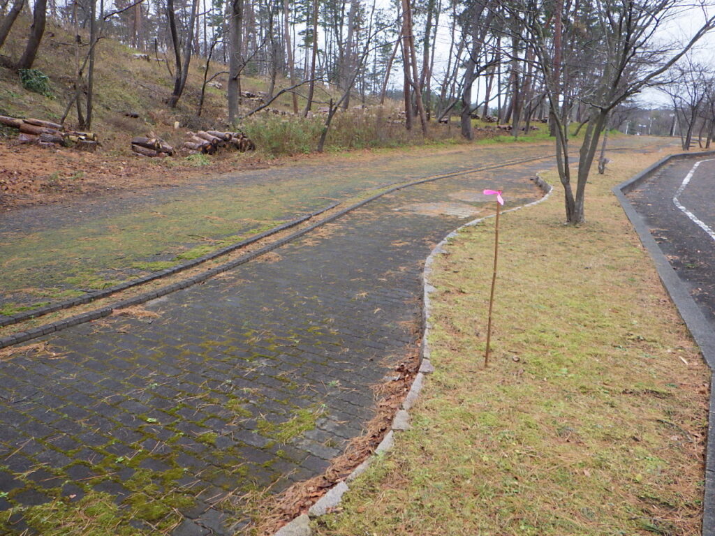 現在、パークウェイ沿いに除雪作業の目印(竹の棒)を指しております。
