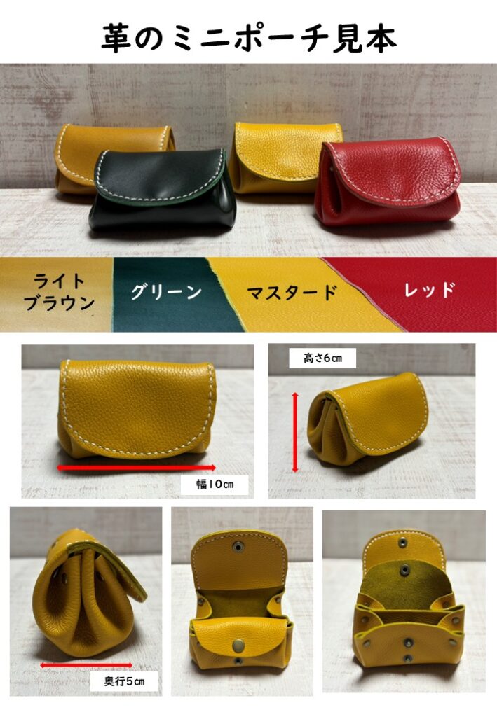 革を使って手の中に入るコロンとした小さなポーチを作ります。サイフとしてもお使いいただけます!