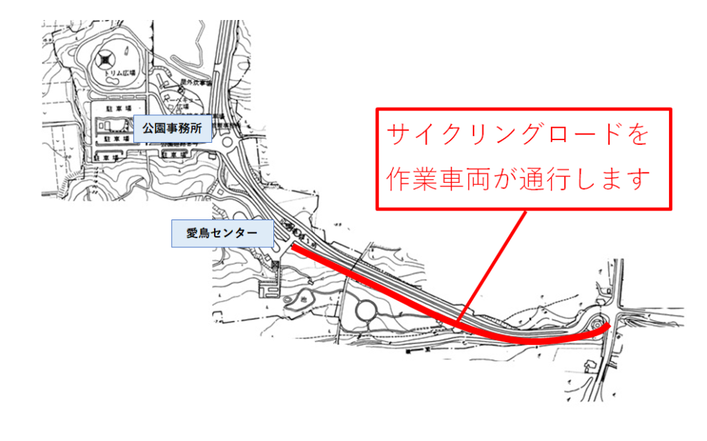 愛鳥センターから県道21号線側公園入口にかけて、サイクリングロードを作業車両が通行しますので、ご通行される場合は、作業車両に十分ご注意いただくとともに、近寄らないようお願いいたします。
