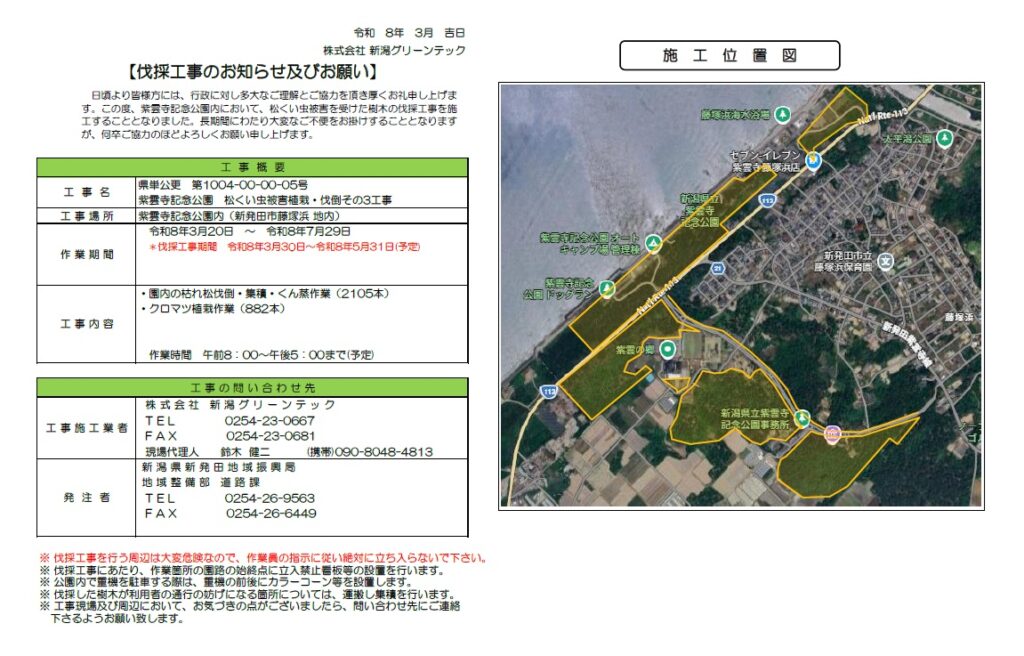 令和8年3月20日(金)~令和8年7月29日(水)の期間、公園内で松植栽・伐倒工事を行います。
